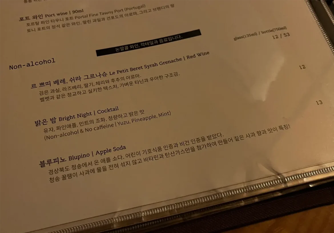 법원에는 술 메뉴도 다양하지만, 알코올을 즐기지 않는 분들을 위한 논알콜 및 저도수 메뉴도 다양했습니다.